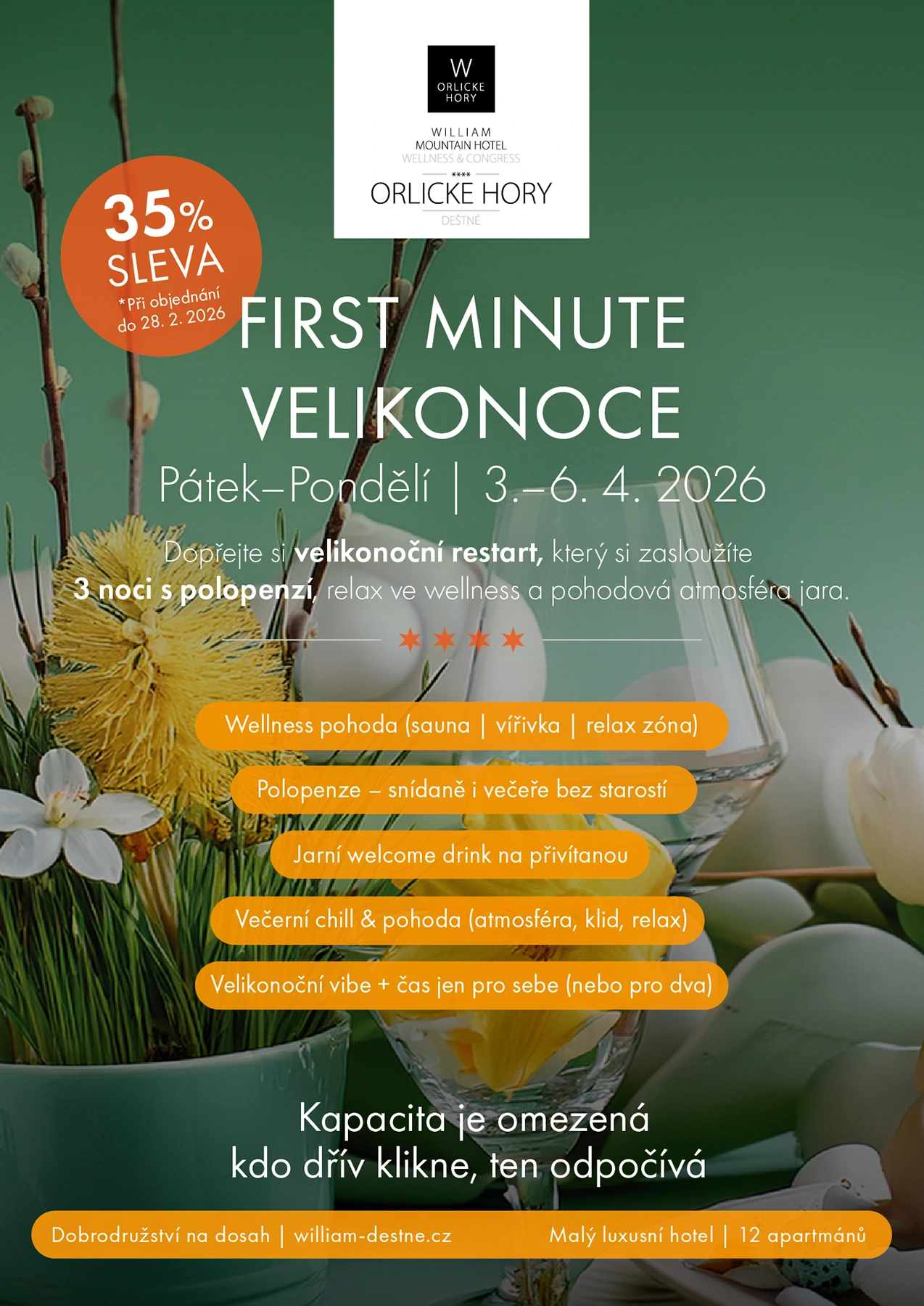 Ikonický čtyřhvězdičkový hotel WILLIAM Congress&Welness Mountain HOTEL v Deštném – samotném srdci Orlických hor Vás okouzlí nejen svým designem a neopakovatelnou atmosférou, ale také individuálním přístupem ke klientovi, moderním vybavením a vysokým standardem poskytovaných služeb. Tento elegantní horský hotel Vám nabízí ubytování celkem až pro 30 osob, ve 2 luxusních apartmánech a 10 moderních a pohodlných standardních pokojích.